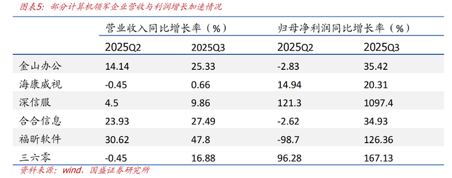根据国盛证券的研究报告,多家计算机领军企业在2025年第三季度的业绩表现优异,增长显著提速。报告数据显示,金山办公、海康威视、深信服、合合信息等公司,其单季度营收或归母净利润同比增长率相较二季度均有明显提升。以金山办公为例,其25Q3归母净利润同比增长高达35.42%,远超Q2的-2.83%,主要得益于AI新产品的落地推广和信创业务的加速。这表明,对于具备核心竞争力和强大执行力的公司而言,AI非但不是“吞噬者”,反而成为驱动增长的“赋能者”。