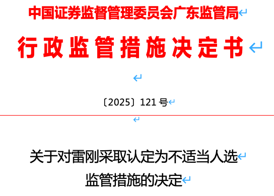 同日,广东证监局还公布《关于对聂晶采取出具警示函措施的决定》和《关于对雷刚采取认定为不适当人选监管措施的决定》。