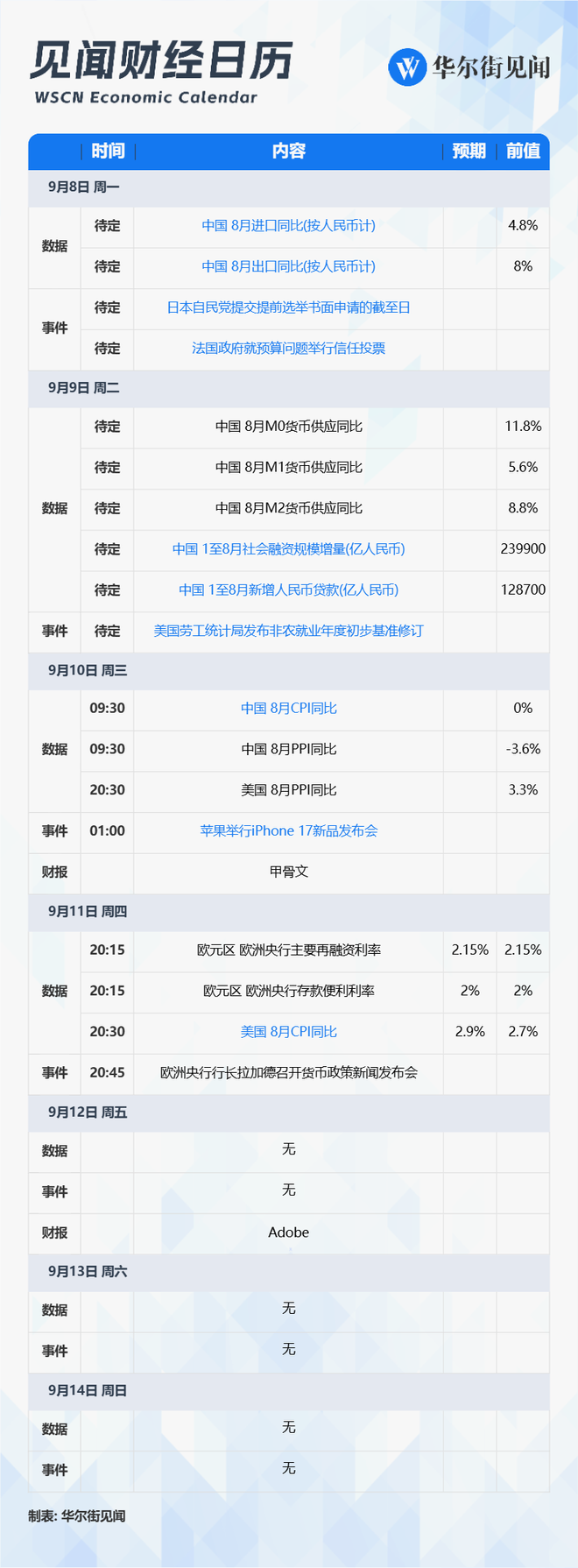 下周重点关注:中国CPI、进出口及社融等重磅经济数据、美国8月CPI及PPI数据、欧央行利率决议、iPhone 17新品发布会。