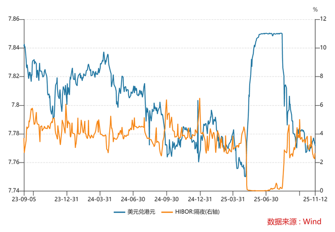 2025年5月初到8月中旬,美元兑港元多次维持在7.85以上(背后的原因是这个期间港元利率持续偏低,美元利率偏高,两者利率差距拉大,全球资金就从港元流出转换为美元资产),金管局不得不进行汇率干预(香港实行“联系汇率制度”,即港元兑美元维持在7.77—7.85的固定区间),方式就是买入港元、卖出美元,把港元从市场上“收回来”。