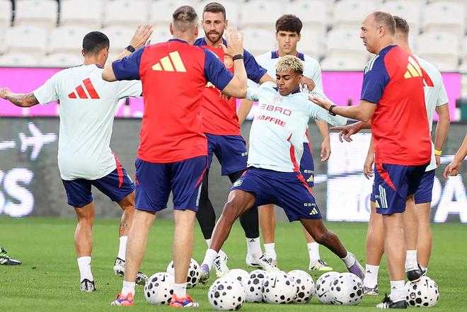 亚马尔(中)尽管背部不适,但还是参加了赛前训练。