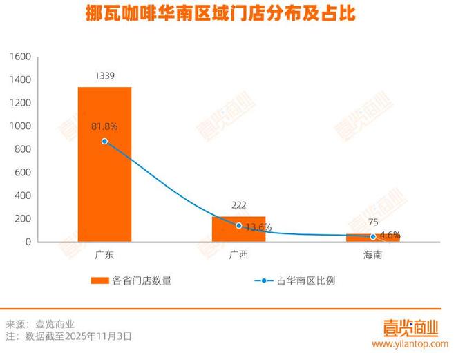在华南区域,广东是绝对主导,拥有1339家门店,占该区域总量的81.8%,占品牌全国门店的17.0%;广西与海南分别仅有222家和75家,合计不足广东的零头,区域内部集中度极高。