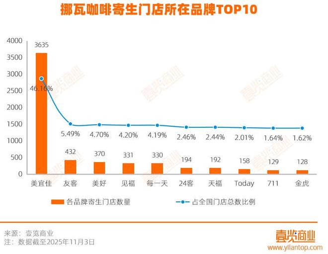 快速布局的同时,其门店模式逐渐清晰。壹览商业数据显示,截至2025年11月3日,挪瓦咖啡寄生店数量达7235家,占其全国门店总数的91.9%,至少涉及121个合作品牌或门店,涵盖便利店、零食店、小型超市、电竞店、网咖等业态。