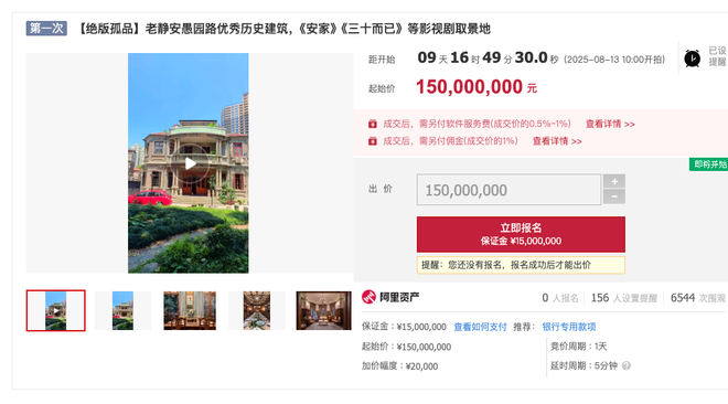 8月3日,红星新闻记者在阿里拍卖平台发现,上海一栋老洋房将在8月13日拍卖,起拍价1.5亿元。