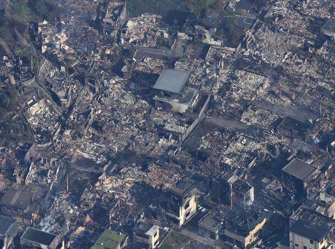 当地时间2025年11月19日,日本大分县大分市,航拍画面显示火灾现场。火灾于18日晚间发生,并蔓延至170多栋建筑。视觉中国 图