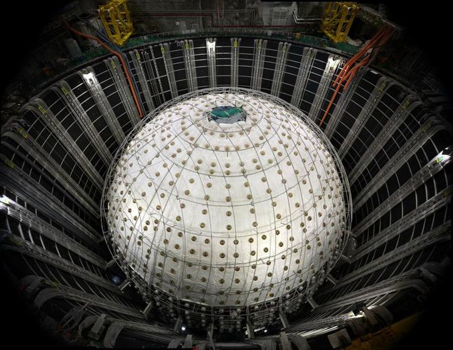 第一帧:2024年10月9日拍摄的建设中的江门中微子实验中心探测器(拼接照片)。其核心是装在巨型有机玻璃球内的2万吨液体闪烁体。这是目前全球最大的有机玻璃容器,它使液体闪烁体的体积比国际现有最大规模增大了20倍。