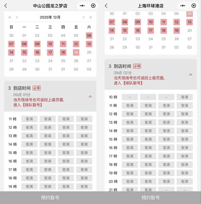 寿司郎小程序显示,其在上海的“双首店”中山公园龙之梦店、上海环球港店将于12月6日同步开业,11月7日开放预约取号。截至11月20日,这两家门店在12月6日-19日所有营业时段均显示“客满”。