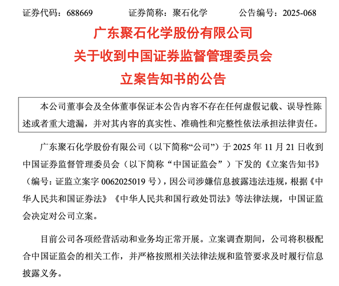 11月21日,聚石化学(688669)公告,公司于当日收到中国证监会下发的《立案告知书》,因公司涉嫌信息披露违法违规,根据法律法规,中国证监会决定对公司立案。