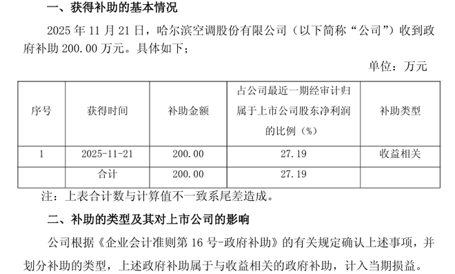 11月21日,哈空调(600202)发布公告,公司于2025年11月21日收到政府补助200万元,该补助金额占公司最近一期经审计归母净利润的27.19%。此次政府补助被划分为与收益相关的类型,计入当期损益。