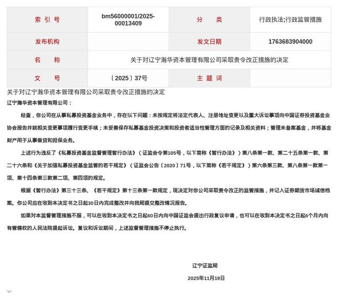 针对以上问题,辽宁证监局决定对辽宁瀚华资本管理有限公司采取责令改正的监管措施,并记入证券期货市场诚信档案。