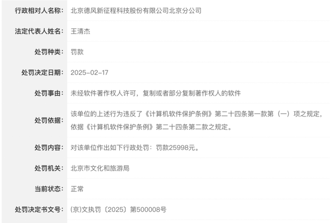 2025年2月,德风科技北京分公司因“未经软件著作权人许可,复制其计算机软件”,违反了《计算机软件保护条例》相关规定,被北京市文化和旅游局罚款25998元。虽然罚款金额不大,但性质严重——对于一家以“AIoT软件解决方案”为核心业务的科技公司,知识产权合规是底线。