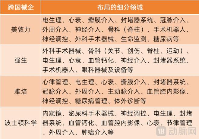 例如,美敦力旗下产品覆盖了电生理、心衰、瓣膜介入、封堵器系统、冠脉介入、外周介入、神经介入、骨科(脊柱)、手术机器人、神经调控、外科手术器械、生命监测、糖尿病等诸多细分市场;