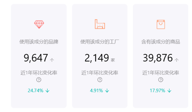 据美修数据,截至目前,使用“红没药醇”的品牌有1.7万个,近一年环比下滑了16%,但使用该成分的工厂超3000家,含有该成分的商品达8.5万个,近一年环比微增了2.85%、6.45%。