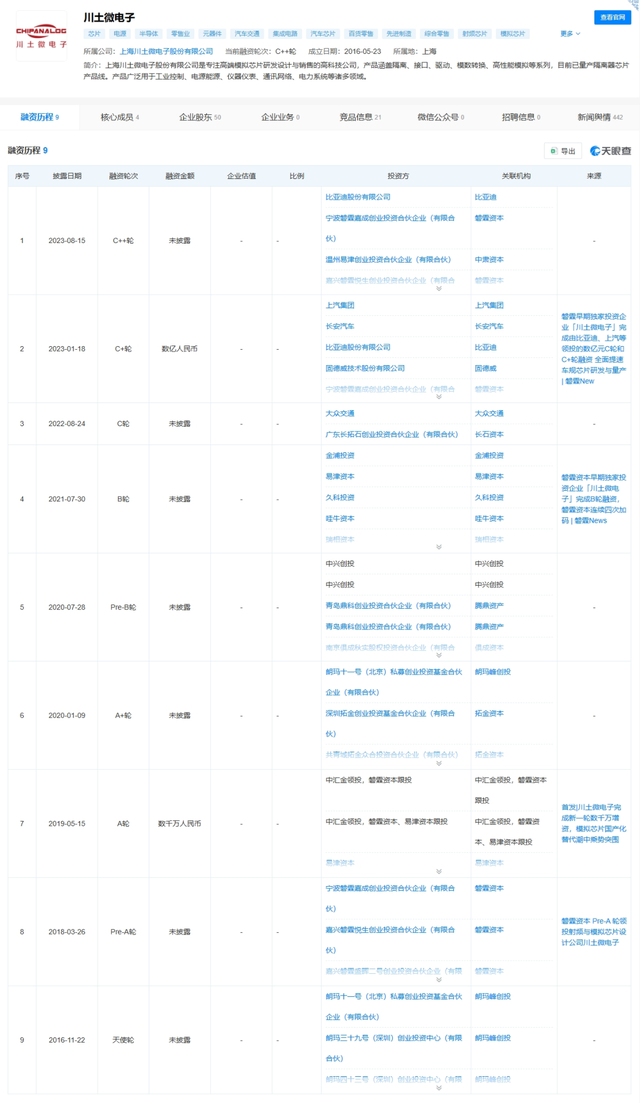 据天眼查显示,截至2023年8月中旬,川土微已完成共计9轮融资,其中不乏比亚迪、上汽集团、长安汽车、吉利资本、汇川技术、中兴创投以及元禾璞华等产业资本和头部机构。
