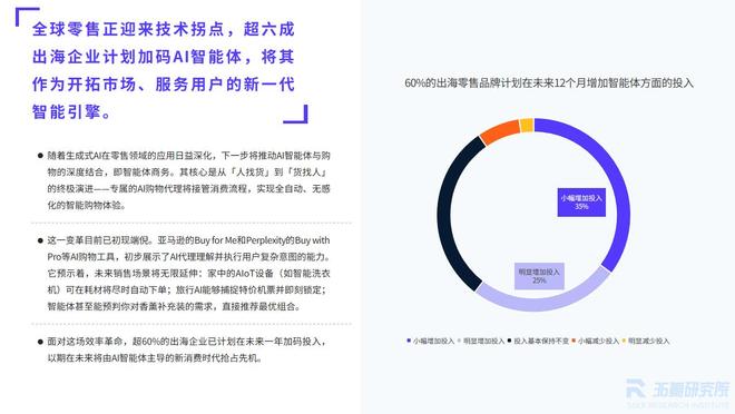 生成式AI的迅猛发展正推动“智能体商务”迅速普及。这一新兴模式通过AI智能体重塑消费流程、拓展销售场景,并显著提升运营效率。值得强调的是,智能体商务并非孤立存在,而是与一体化商务深度耦合:在AI赋能下,品牌能够实现超高效、高度个性化的无缝体验,形成“一体化×智能化”的倍增效应,开辟全新增长空间。然而,目前出海企业对AI智能体的应用仍处于探索阶段,其在营销推荐、供应链优化、支付风控等环节的潜力尚未充分释放,未来增长前景广阔。