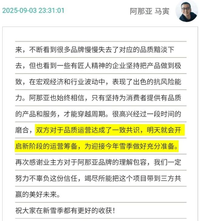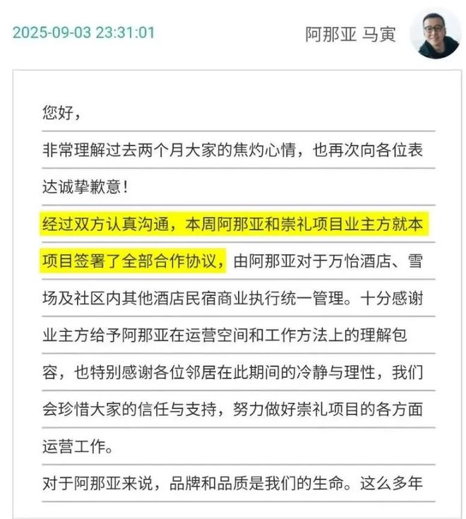有业主社媒上分享,9月3日晚间阿那亚品牌创始人马寅再发回信,称双方经过认真沟通,就本项目签署了全部合作协议。