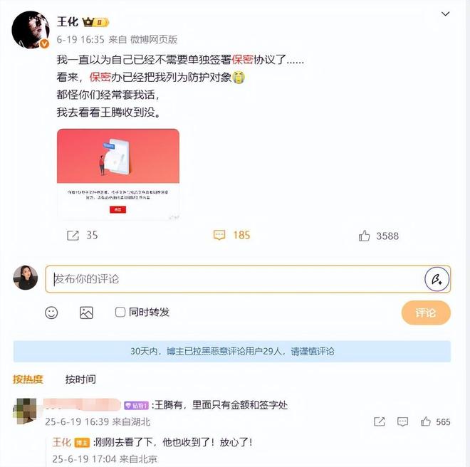 从创立起就把“商业保密”写进核心制度的小米,连基层员工入职第一天都要签保密承诺书。今年6月王化曾发博表示,“我一直以为自己已经不需要单独签署保密协议……看来,保密办已经把我列为防护对象。都怪你们经常套我话,我去看看王腾收到没。”并在评论区回复网友,“刚刚去看了下,他也收到了!放心了!”