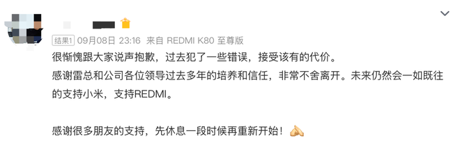 这位在数码圈拥有极高知名度、被视作雷军爱将的小米中层干部,随后在微博回应:“很惭愧跟大家说声抱歉,过去犯了一些错误,接受该有的代价。”