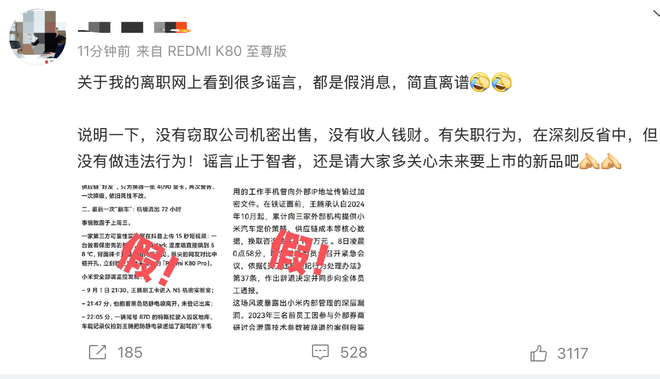 针对这些传言,王腾在新浪微博称:“都是假消息,简直离谱。没有窃取公司机密出售,没有收人钱财。有失职行为,在深刻反省中,但没有做违法行为!谣言止于智者,还是请大家多关心未来要上市的新品吧。”