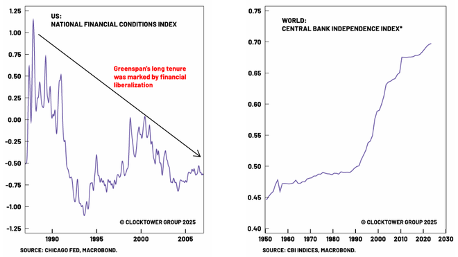 图:格林斯潘积极推行新自由主义金融自由化(左)“新自由主义”下的央行独立性是“华盛顿共识”的产物(右)