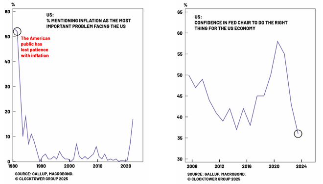 在这种条件下,尤其是在公众支持率跌至历史低点之际,美联储赖以保持独立性的政治资本逐渐流失。一个曾经依靠两党共识保护的机构,如今暴露在公众敌意和总统攻击之下,不再拥有沃尔克—里根时代保护它的那份合法性基础。实质上,政治环境迫使美联储不得不随民粹主义潮流而动。换言之,其政策取向可能愈发呼应民粹优先事项:维持宽松的货币环境以支撑资产价格,并在“就业市场强劲”的名义下容忍更高的通胀。