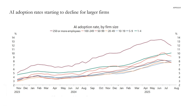 比高盛报告揭示的“增速放缓”更引人担忧的是,大型企业的AI采用率可能已经见顶回落。