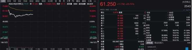 截至发稿,大行科工涨幅缩窄至23%,报61.25港元/股。