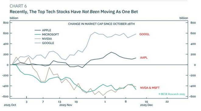 然而,一个积极的信号是,近期这些头部科技股的走势开始分化。报告指出,在过去一个半月里,当英伟达和微软的市值分别蒸发近5000亿美元时,Alphabet和苹果的市值却分别增加了6000亿和2000亿美元。这种分化表明,市场并未将所有科技股视为一个整体,价值投资者仍在对部分公司的价格进行验证。