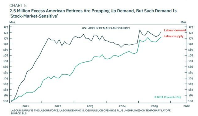 BCA Research在报告中明确指出,当前美国经济的一个关键支撑来自于约250万“超额退休”人群的消费支出。这部分人群因新冠疫情后的股市繁荣而提前退休,他们的消费能力与股市表现直接挂钩,形成了一个“对股市敏感”的需求侧。