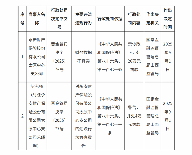 9月8日,国家金融监督管理总局山西监管局发布的行政处罚信息显示,永安财产保险股份有限公司(以下简称“永安财险”)太原中心支公司因财务数据不真实被责令改正并处26万元罚款。时任永安财险太原中心支公司总经理毕志强被警告并罚款4万元。