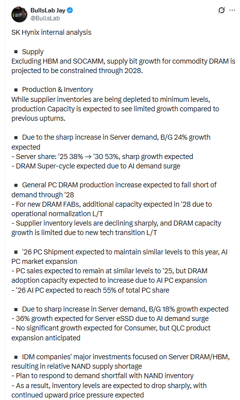 SK海力士的内部分析显示供应紧张将持续至2028年,比瑞银预计的2027年一季度更为严峻。这意味着存储芯片涨价周期可能超出市场预期。