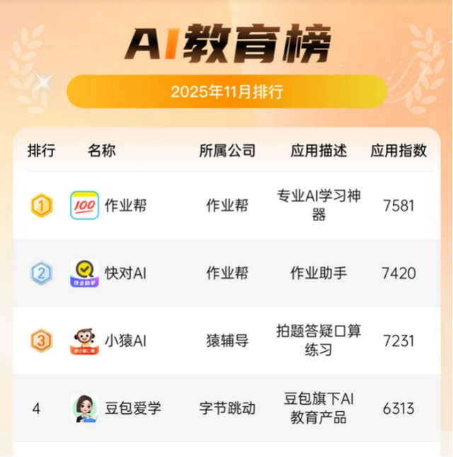 这种基于教育基因的自然转化,构成了作业帮在AI教育赛道上的先发优势。思维火花公众号《11月中国AI应用排行榜》显示,在综合下载量、用户评价、AI原生度和实际体验来构建应用指数排名中,作业帮和旗下快对AI以7581和7420的应用指数排名前列。
