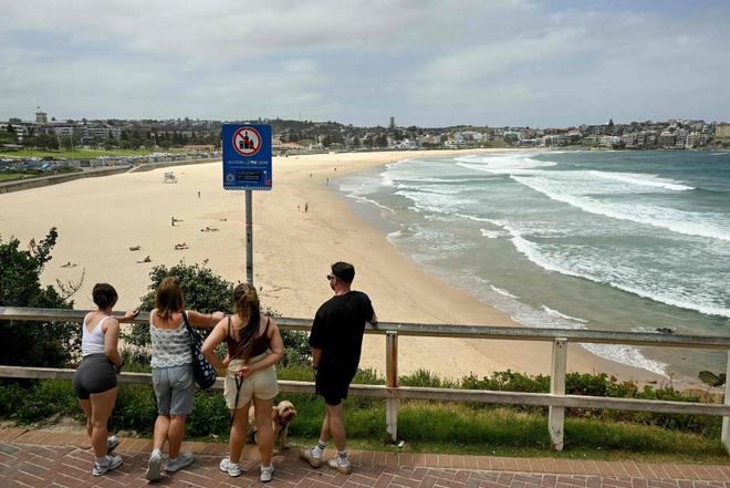 12月15日,澳大利亚悉尼,枪击事件次日,人们在邦迪海滩边望向事发地点。