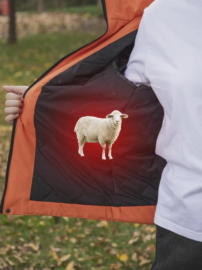 这件外套夹层有着一层100%绵羊毛内胆,一上身就开始蓄热!