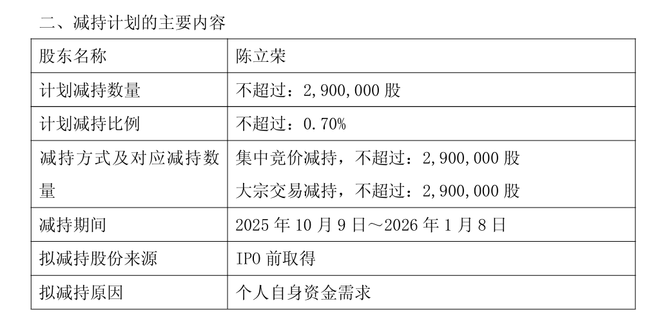 根据个人资金需求,陈立荣拟自本公告发布之日起15个交易日后的三个月内(2025年10月9日至2026年1月8日),通过集中竞价交易方式或大宗交易方式减持其持有的百合花无限售流通股份合计不超过290万股(占个人无限售流通股份的24.81%,占公司总股本的0.70%),减持价格依据市场价格确定。