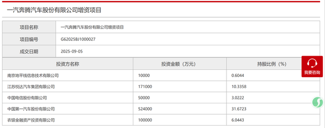 除大股东中国一汽之外,江苏悦达汽车集团有限公司(简称“江苏悦达集团”)、中国农业银行旗下投资平台农银金融资产投资有限公司(简称“农银金融”)、中国电信股份有限公司(简称“中国电信”)、南京地平线信息技术有限公司(简称“南京地平线”)分别向一汽奔腾投资17.1亿元、10亿元、5亿元、1亿元。