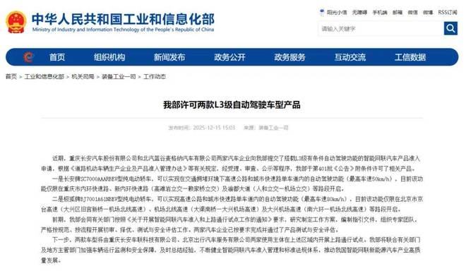 在同一时间轴的另一端,中国工业和信息化部正式批准了长安和极狐两款L3级自动驾驶车辆的上路试点,划定重庆和北京的特定区域作为测试场地。