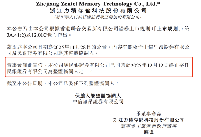 随后,12月12日,力积存储发布整体协调人退任公告,表示公司和民银证券已同意于当日终止委任民银证券为整体协调人之一。此外,中信里昂仍担任其保荐人兼整体协调人。