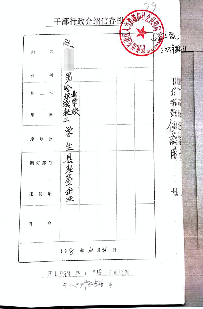 “那份介绍信,我没有拿到,甚至没见过。”赵先生说,如今只在长清区人社局看到“小半边存根”。