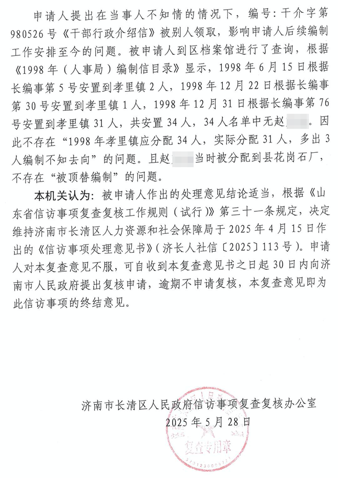 2025年5月28日,济南市长清区政府信访事项复查复核办公室出具的《信访事项复查意见书》回应称,经查,赵先生反映原长清县人事局未给其分配工作的问题不属实,理由是:经查档案资料,根据原人事局毕业分配办公室为赵先生开具的《干部行政介绍信》存根(编号为“干介字第980526号”)显示,赵先生被分配到县经委企业。