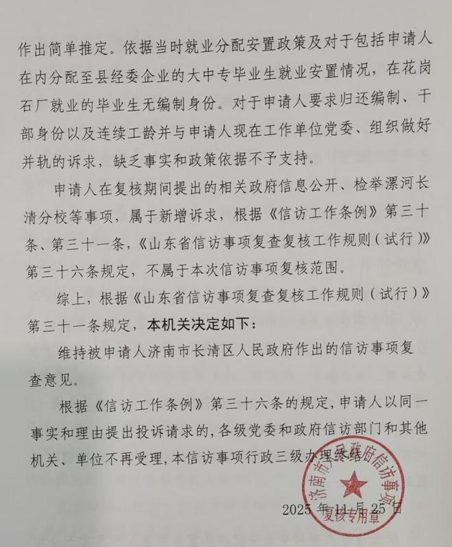 此外,济南市政府《信访事项复核意见书》还表示,依据当时的就业安置情况,在花岗石厂就业的毕业生无编制身份。因此,对赵先生要求归还编制、干部身份以及连续工龄并与其现在工作单位党委、组织做好并轨的诉求,缺乏事实和政策依据,不予支持。