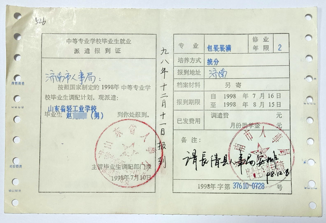 两年后的1998年6月,赵先生中专毕业。随后,他拿着毕业生就业派遣报到证于1998年12月11日前往当时的长清县人事局(现更名为长清区人社局)报到。