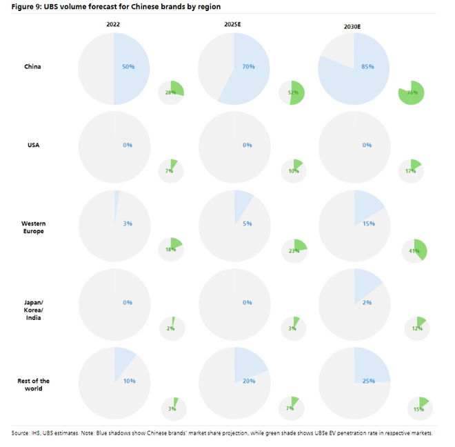 在国内,瑞银预计,中国自主汽车制造商的市场份额将从2022年的约50%、2025年预计的70%,进一步上升至2030年的85%。