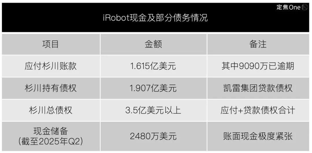 iRobot欠杉川的债务合计超过3.5亿美元(应付账款1.615亿+贷款1.907亿),占其总负债的70%以上。而iRobot账面现金仅剩2480万美元,已资不抵债。