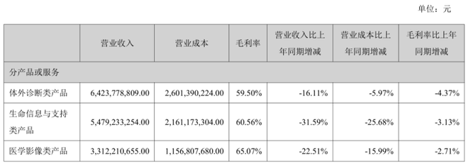 从营收构成上看,迈瑞医疗主营业务主要涵盖体外诊断、生命信息与支持以及医学影像三大业务领域。财报显示,今年上半年,迈瑞医疗三大产品线营收均出现了两位数以上的下滑。其中,公司第一大营收来源的体外诊断业务实现营收64.24亿元,同比下降16.11%,销售毛利率为59.5%,较上一年同期下降4.37个百分点。国内市场方面,受日益激烈的竞争环境和持续深化的医保改革等多重因素影响,上半年迈瑞医疗体外诊断试剂的检测量和价格均出现了一定幅度的下滑。