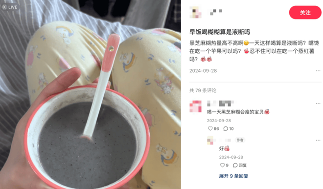 白领打工人液断的食谱中,除了DIY奶茶食谱、自制东方树叶奶茶外,还添加了一些古早产品的身影,例如无糖版南方黑芝麻糊。
