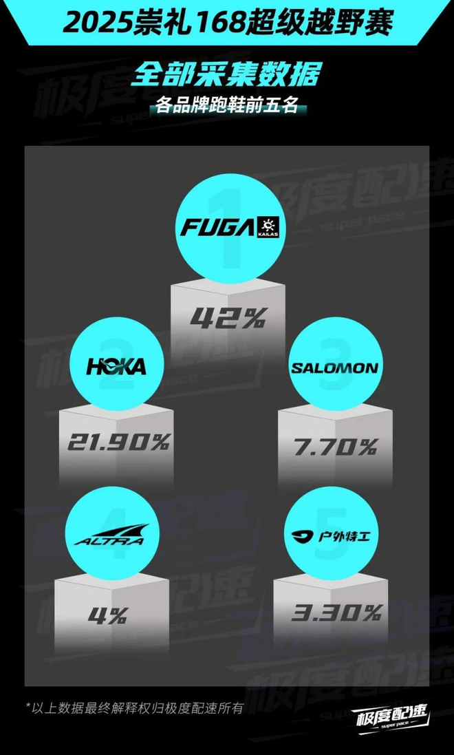 极度配速统计数据显示,在今年的崇礼168超级越野赛上,凯乐石FUGA以42%的比例成为全场越野跑鞋穿着占比最高的运动品牌。HOKA和萨洛蒙分别以21.9%和7.7%的占比分别位居第二、第三。