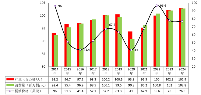 图:2014-2024年世界石油产量和消费量;数据来源:BP,IEA,公司公告