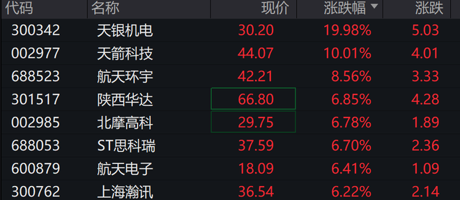 商业航天概念股反复活跃,天银机电、天箭科技涨停,航天环宇、陕西华达、北摩高科等大涨。