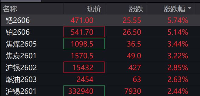 国内商品期市午盘多数上涨,钯金涨6.66%,焦煤涨4.38%,沪锡涨3.10%,玻璃涨2.22%,集运指数(欧线)跌3.44%。